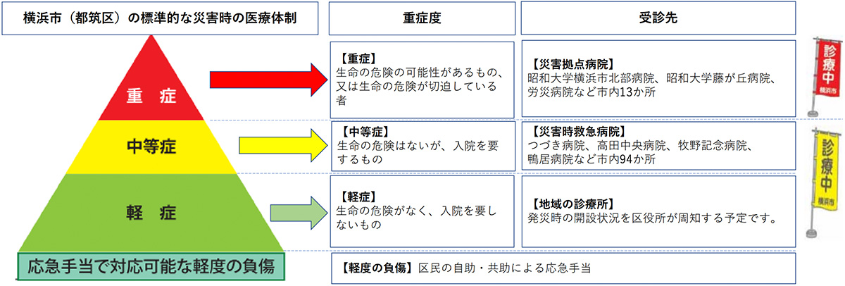 発災時には、医療機関等の通常の診療はできない事が想定されます。負傷者の受診については、混乱が起きることを避けるため、ケガ等の緊急度・重症度に応じて医療機関を選択することになっています。